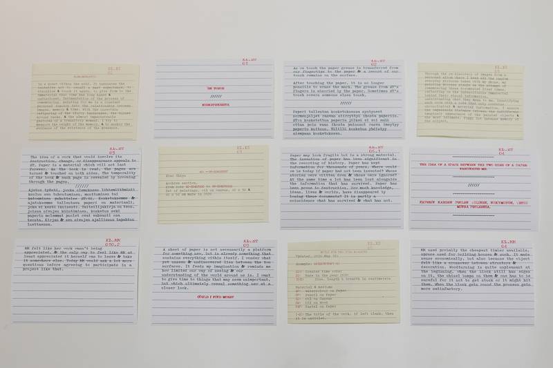 Installation view: Index Cards, is an experimental curatorial intervention to facilitate the transmission of knowledge.