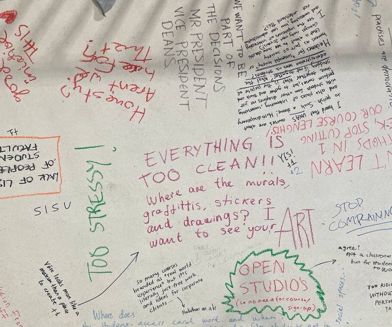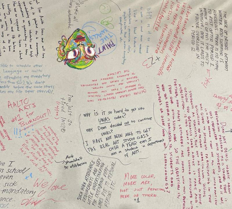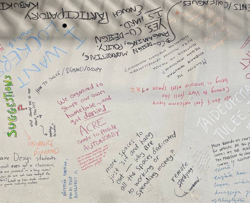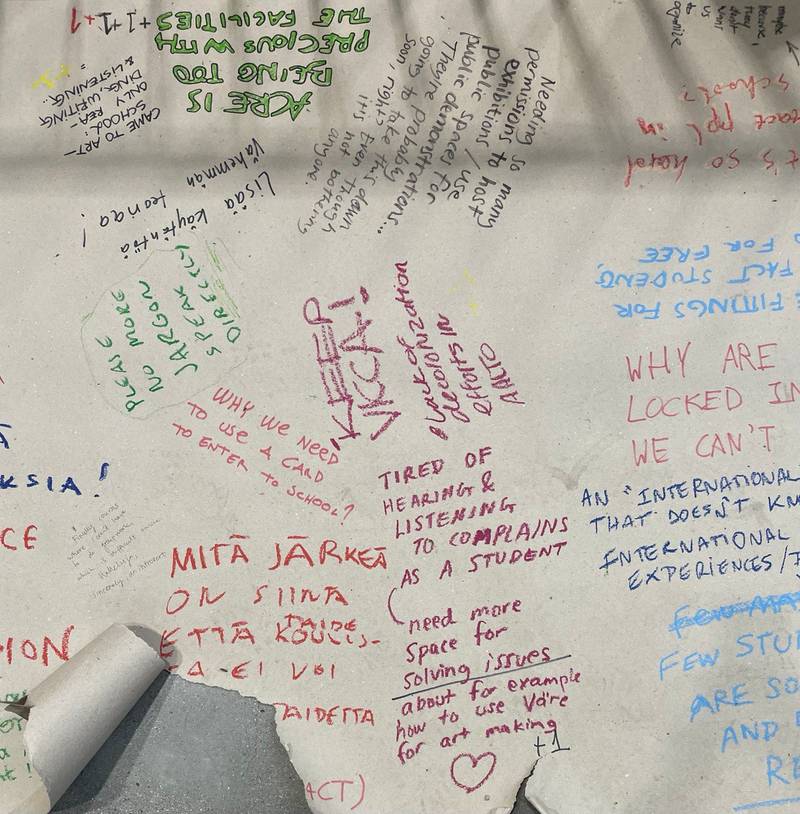 The Väre building, which started by materially dissolving all previous communities created around disciplines and programs, is a neat finishing touch to this control policy. To have a building that should host making, studying, researching, and exhibiting arts but lacks spaces for making, studying, researching, and exhibiting them. The school finally took some measures because of significant and voiced dissatisfaction, but the building remains a hostile environment for its users. Ironically, the metro station and the supermarkets and cafes make for a much more welcoming atmosphere, where many people take their studies and meetings.