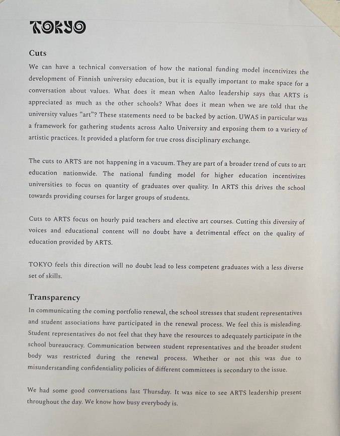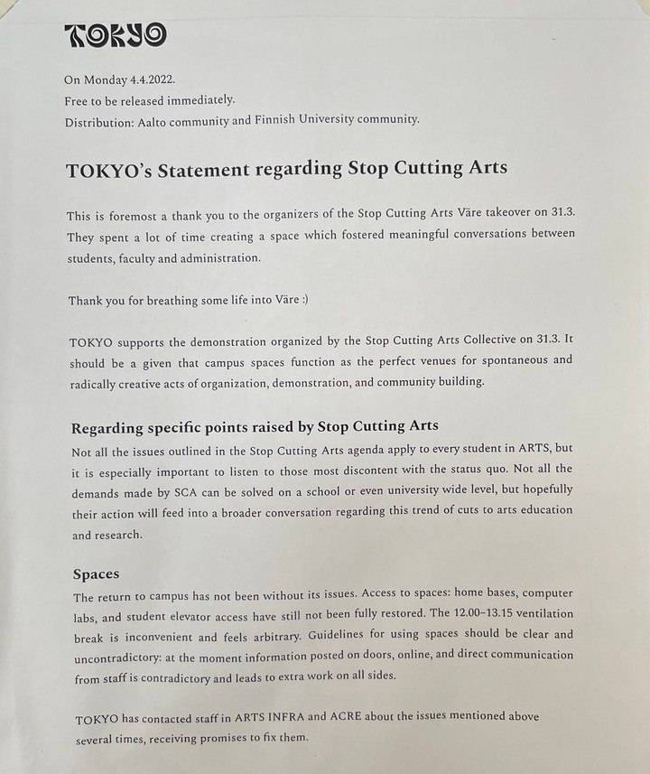 One is reminded of the famous ghost of the Communist Manifesto: students in the Aalto University School of Arts, Design and Architecture have taken to occupy the ARTS building Väre, organising demonstrations and negotiations with the university representatives. Not bad!
