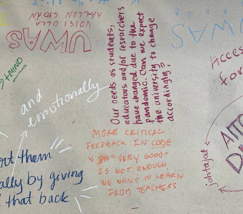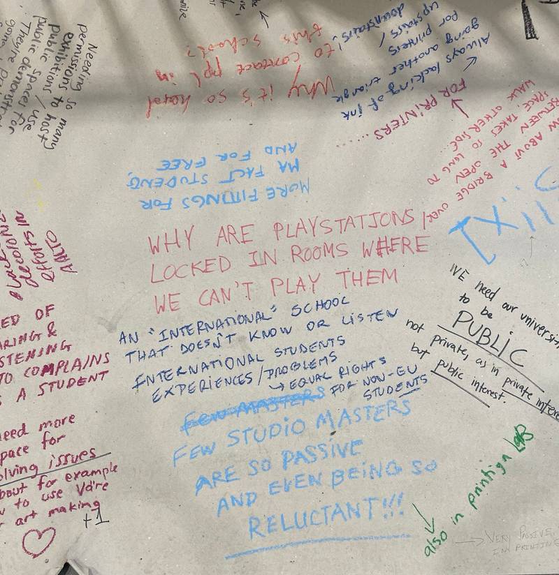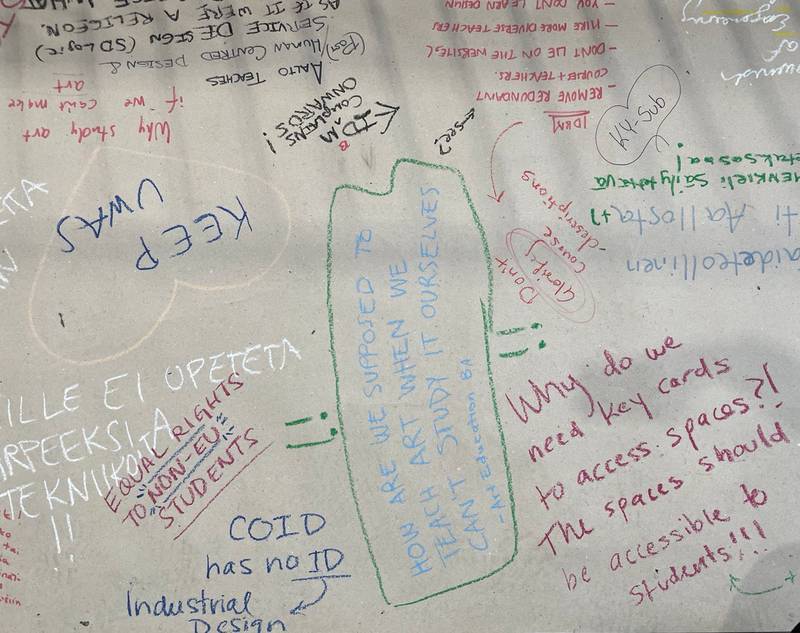 Money may be something the university establishment is even ready to discuss and negotiate – money is a quantifiable, concrete resource, and negotiating it will not necessarily touch and question power structures and practices. It would be nice if instances like units and programs were able to decide how to deal with cuts of funding, e.g. how to find economical studio spaces or take teaching out of the academy and how to juggle with inviting visitors to keep the curriculum updated. Though Aalto has been adamant that teachers and students should use only Aalto spaces, reluctant to allow programs like ViCCA to find alternative solutions outside Aalto premises. And even more adamant about keeping to its structures and practices of power – control by precarisation and hierarchisation.
