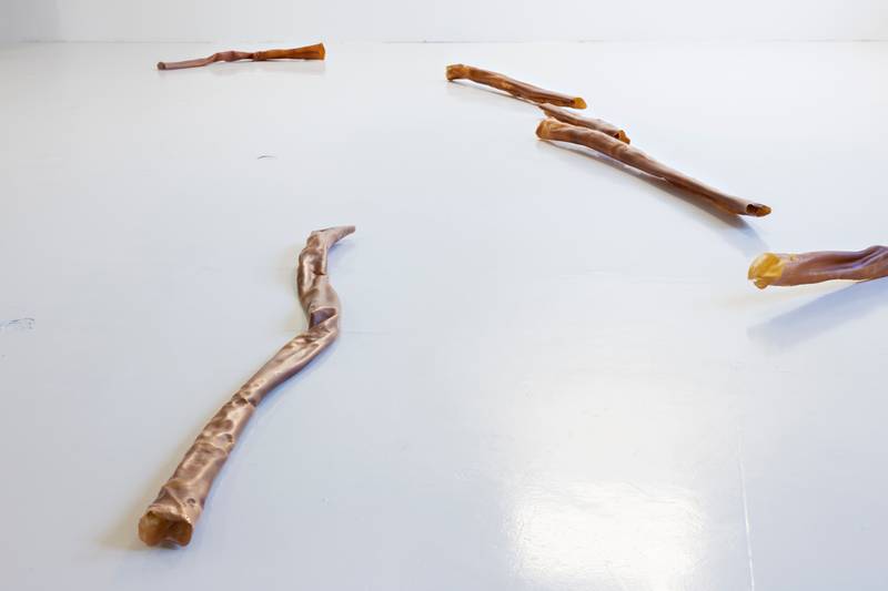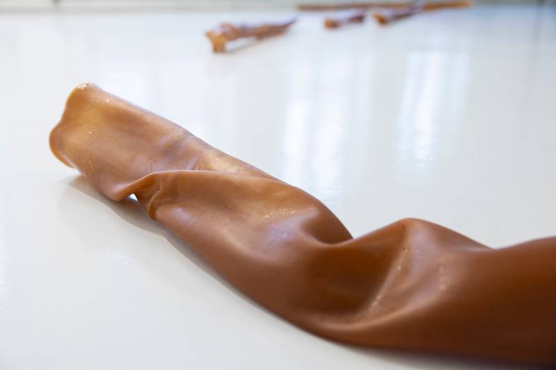 On the opposite end of Byrne’s work is Vainio’s series of organic sculptures ( ) (2020). Vainio’s work highlights the fragility of life, a connection between humans and other life forms along with the organicism of nature.12 This is communicated through the materiality of the bone glue and iron-oxide pigment. When paired together, the two create an organic shape that evolves over time as the glue dries, thus forming a deep amber, leather-like form that resembles an empty shell. The sculpture implies the presence of an organism that outgrew and abandoned the shell that created it, therefore becoming a gesture that mimics birth.
