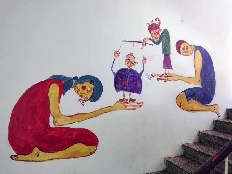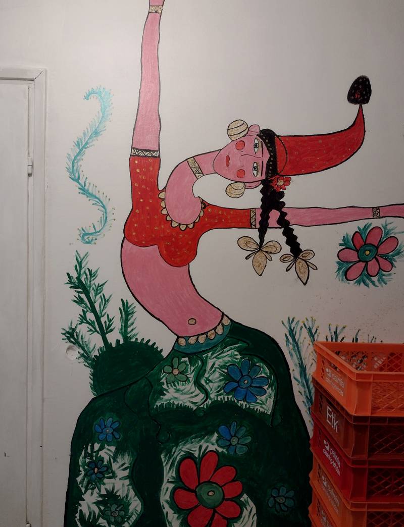 GABRIELA: My mother made food in a big cauldron, delicious stews with meat and vegetables served with polenta made from corn flour. She used the vegetables she planted in our garden and the animals she raised in our yard. She raised pigs and chickens, and in the garden, she planted onions, potatoes, tomatoes, carrots, and everything we needed. Us children helped her out with the work around the house. We were seven children—four girls and three boys. Sometimes our mother brought the cauldron in front of the house, on the street, for people to eat together, and we all sat together like that, adults and children, and ate, talked, and played. A Finnish artist who came to paint the walls of the social8 a few years ago turned my story into this painting. But she only painted the polenta. And the text she wrote above the painting says, ‘My mother makes the best polenta in the world’. I laughed when I saw that. How can all of us be satisfied with just polenta? My mother also cooked meat and vegetables to go with it. But I told the artist that she did a good job.