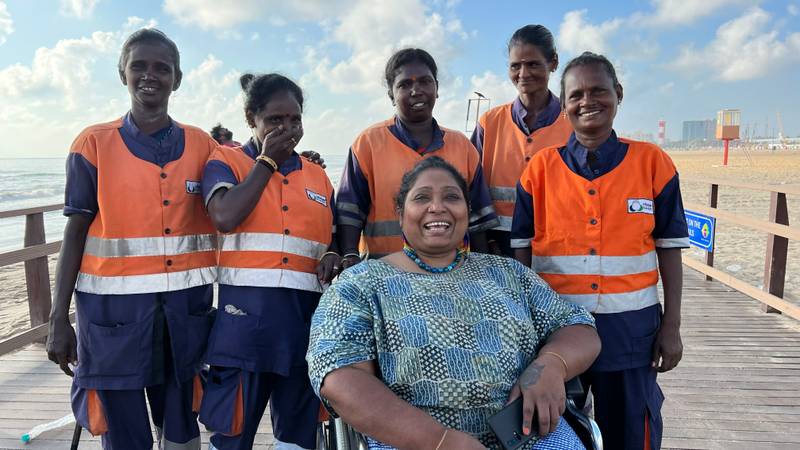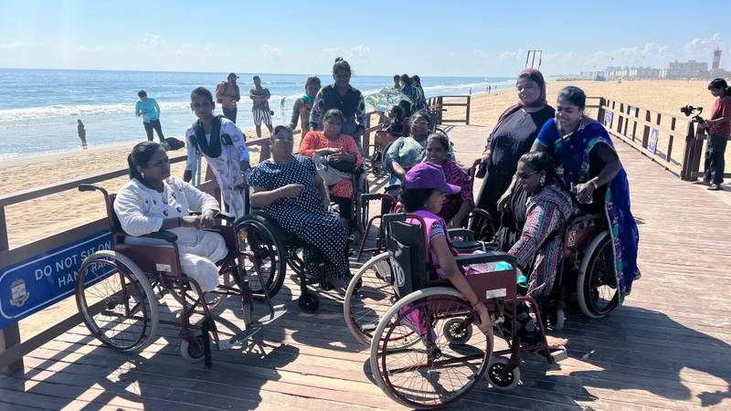 These photos were taken after a ramp was inaugurated at the Marina Beach in Chennai for people with disabilities. It was the first time that most women from Aish’s shelter went right up to the beach. Watch video.
