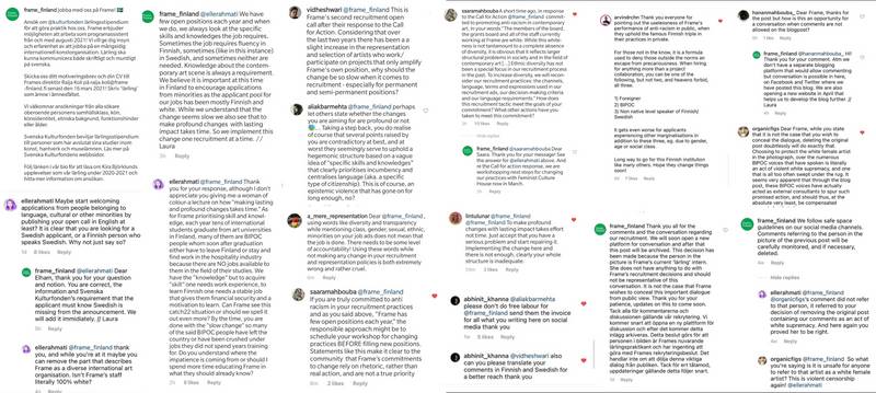 It all began with a now-deleted post on Frame’s Instagram account when the open call for an internship position supported by the Swedish Cultural Foundation was published only in Swedish. What started with a few questions regarding the nature of the open call soon grew into a heated debate and triggered an opportunity for the exposure of several arguments and points of view in the form of a much-needed conversation regarding Frame’s recruitment and engagement policies.