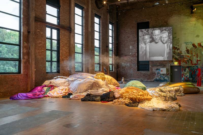The fluidity and unclear nature of the conceptual starting point is deliberate, and as aesthetics of an exhibition, it works. At the same time, I am left thinking about the argument(s) the exhibition serves. An exhibition architecture in flux, such as in this year’s GIBCA allows for overlapping and contradictory arguments that are present at the same time in the same room. For example, in the main exhibition hall on the second floor at Röda Sten, an installation in the centre of the room consisting of huge colourful breathing pillows under which smoke emerges at times called Yabba (2017/2023) by Maria Jerez meets a superb video work titled S (2017) by Luiz Roque, hung high up on the wall. The seemingly soft shapes of Jerez’s installation call to slow down and breathe while thinking about the transformative writings of activist and artist Jota Mombaça, on which Roque’s video is based. The same kind of crossing of materiality and queer speculation is present in the textile-based works of Esse McChesney in the same venue. Adapting the techniques of weaving and embroidery, the artist presents a beautiful series of works in which the visual representations of different species, trans bodies, and contexts collide. McChesneys work’s are among the best and most thought-provoking in the exhibition.