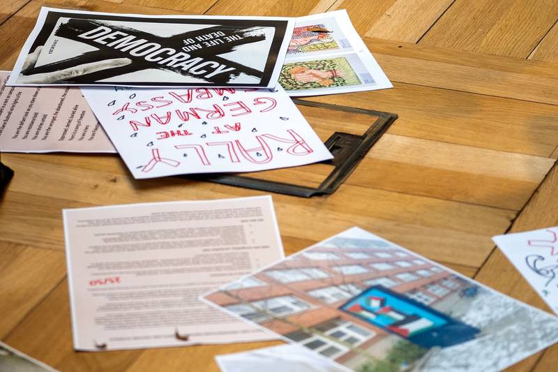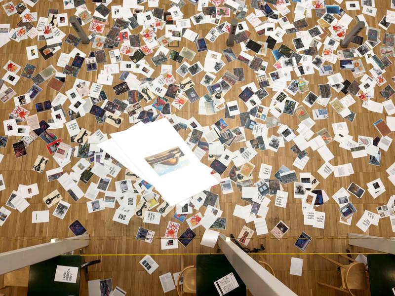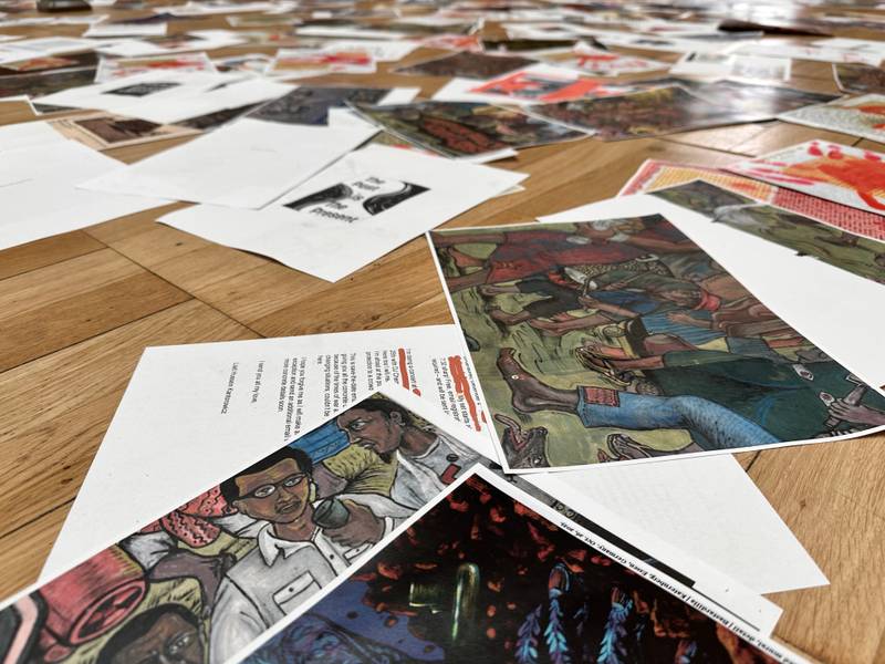Artwork prints as seen on the floor of the exhibition display. ABSENCED. Slottet, Malmö City Library, Malmö. Image courtesy of Khaled Barakeh.