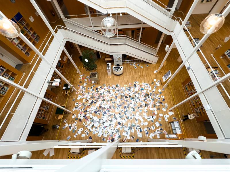 Choosing a Swedish public library as an exhibition space comes with a set of additional associations and connections. The public library as an institution has a significant lineage pointing to the country’s modern history of popular movements and civic education, popularly known as folkrörelser (People’s Movements) that were aimed at creating ‘democratic citizens.’ In addition, staging the exhibition in an open yard of the library made it highly accessible, free of charge, and at the same time a chance encounter rather than a committed visit. A diversity of people could pass through and still witness the printers spewing out prints of artworks on the floor. In fact, prints could also be taken home by people.