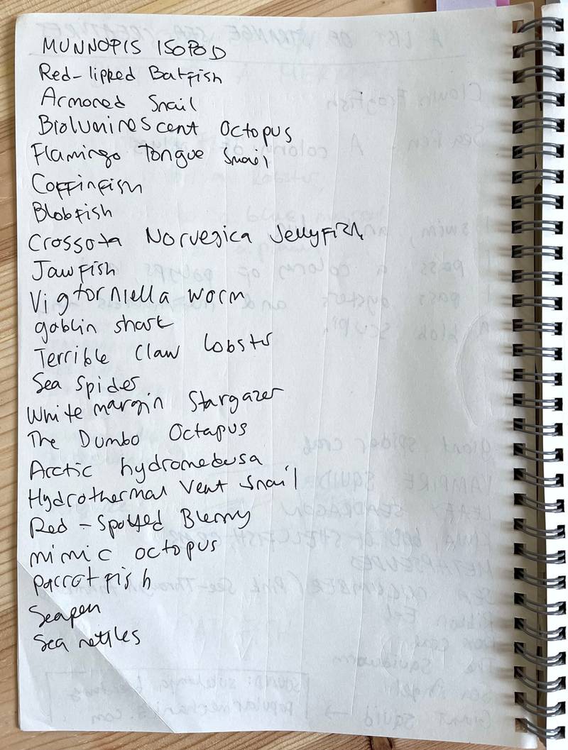 Writing is always central to my work and the beginning of every process. I write a lot. I have notes on my phone, in notebooks, sometimes on random pieces of paper. I write observations, thoughts, notes on books I read, sometimes diary. I love lists, and I write a lot of lists, or just sentences that resonate. With the context of this project I was researching things such as funny sounding sea creatures, such as a sea cucumber or a vampire squid, which are then written into the story. Then once a broader idea or concept emerges, I begin to select and refine these notes through extensive editing, re-writing and trying to carve out a narrative or an emotion that carries the script. For me, language, alongside music, is one of the most powerful tools to convey emotions.
