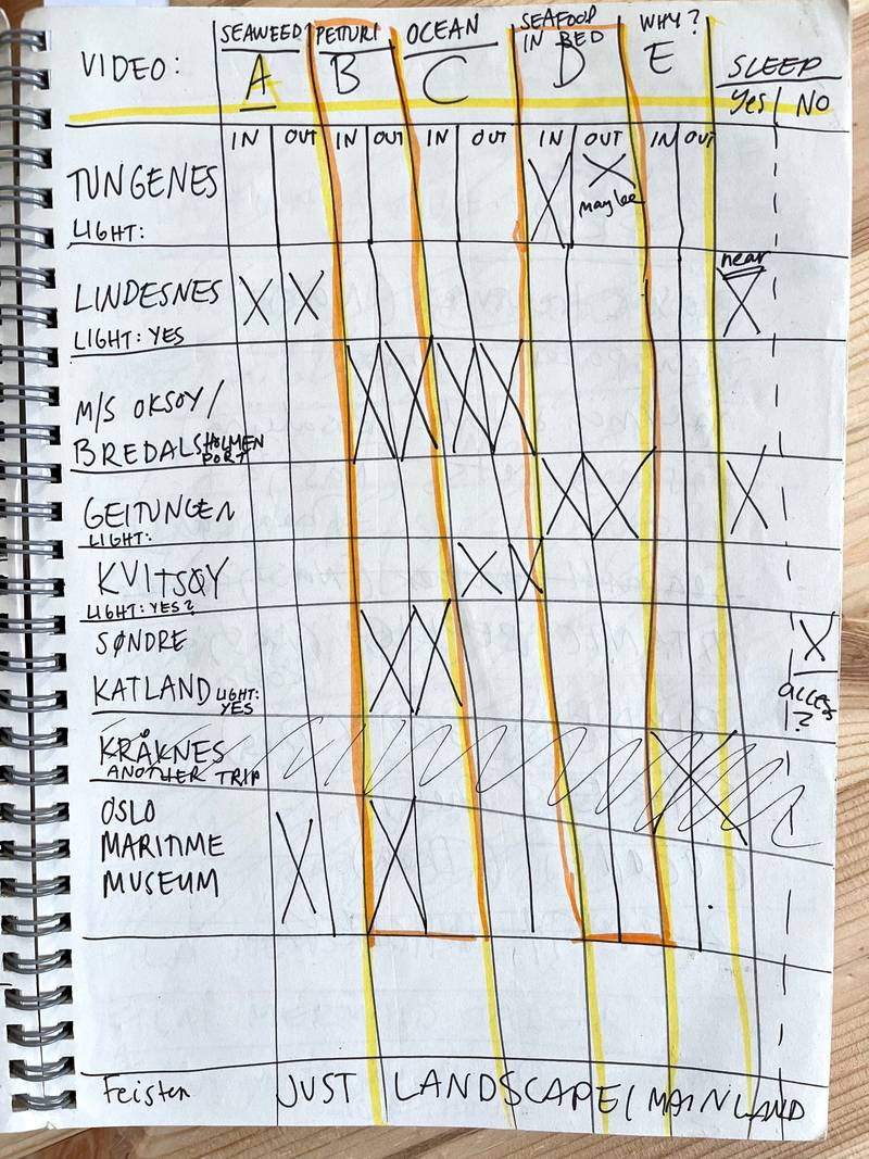 For this specific project, I used my sketchbook to capture notes from interviews, lists, and various details that eventually become sentences. The sketchbook also includes notes on site visits, filming locations, and logistics. For example, it contains pragmatic notes like whether to film inside the lighthouse and the best times for filming.