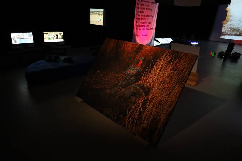 This leads to another important visual code of the exhibition, embodied in the set design: if the mood and the setting are party-like, the layout itself resembles the structure of a religious hall and spiritual site. Similarly to religious places, the largest and most visually intense work is set at the end of the space, and its aesthetics also evoke sacrality. Noor Abed’s 20-minute film ‘Our Songs Were Ready for All Wars to Come’ enacts the mourning and commemoration rituals devised from Palestine’s ancestrality and folktales. Sacral associations are reinforced by the structure of an altar with various objects (chess pieces, flags, scraps, cards, candles, feathers) that look like an assemblage of objects washed up from the sea, victims of forced migration. Significantly, the ecological messages in the exhibition are articulated not through a didactic condemnation of the anthropocene but by experiencing nature as part of oneself. For example, through reclaiming peasant dances that communicate with the landscape and lying down on the earth (‘Our Songs Were Ready for All Wars to Come’), merging with the sea and trying to bury oneself in the sand (Pedra Costa’s video diptych) or mechanically pasting pictures of bodies into another environment (‘Show Analysis 03’ by Gabriele Gervickaite) to underline the discomfort of these situations. At the same time, bodily gestures express intense mental and spiritual processes in almost every work, and its choreography is led by historical and folkloristic motifs and references, as well as post-digital aesthetics. The exhibition also reminds us about the exploitation of nature for economic profit and draws similarities to the violence towards people from contested territories.