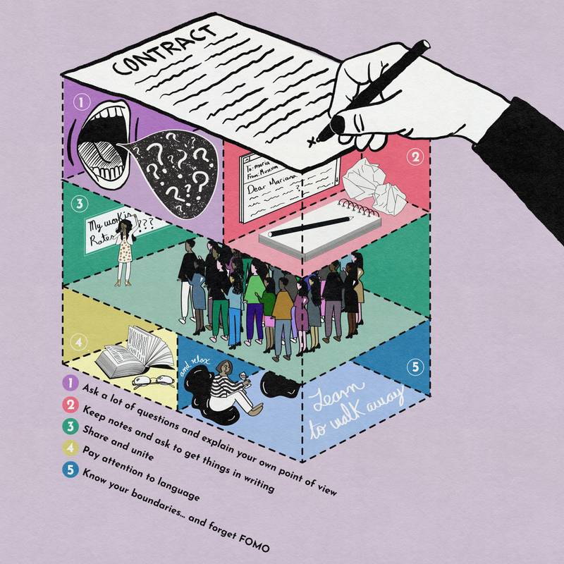 Finally, always be ready to walk away. While it is true that something is a common agreement practice in the arts, this does not necessarily mean that the practice is fair or good and should be maintained. Think of what are the things that you are not willing to give up are, and then be clear about those boundaries. There is a sense of urgency related to working in the art world, and it can be a wonderful thing to change the status quo, make things happen, or not to stagnate. However, the sense of urgency sometimes transforms into its evil twin, what I like to call FOMO—the anxiety-creating dread that you can’t say no, because this opportunity will be (for whatever reasons) the one that makes or breaks your career. It probably isn’t! FOMO makes us accept contract terms that we are uncomfortable with. It may feel counterintuitive to walk away from something that from the outside looks like a once in a lifetime opportunity, but it’s never ok to be exploited.