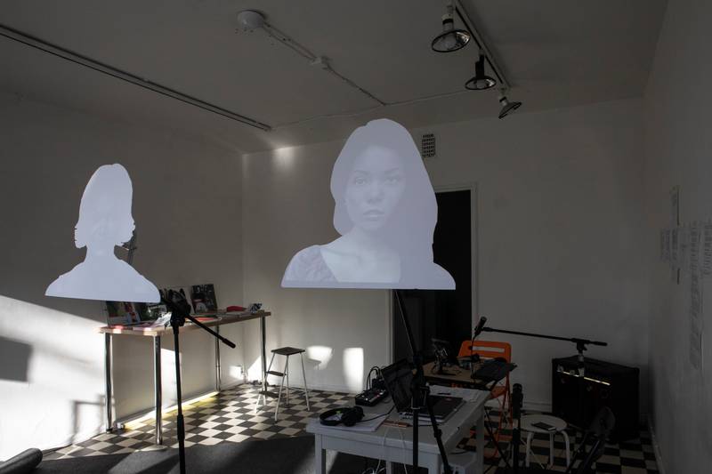 It is March 13th, 2021. A stricter lockdown has just been introduced in Helsinki, everything is closed, but you can still visit private museums and galleries by appointment. With my friend Dahlia, we just saw a comprehensive Finnish ryijy3 exhibition in Taidehalli, and walked down the slushy streets of Töölö. As we walk past Oksasenkatu 11 gallery, through the window, I notice Grégoire Rousseau sitting at a table, surrounded by wires and screens, a microphone stand in front of him. A video projection of what appears to be two female avatar faces4 can be seen through the window; the gallery space looks quite empty otherwise. Grégoire seems busy, so we wave hello and continue our journey. The intriguing concert program of Digital Commoning Practices is already online, but as it happens too often these post-winter days, the Zoom fatigue is especially acute in the evenings, so I put it off for later.