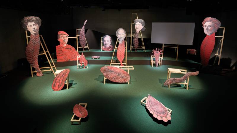 Continuing Staal’s practice of staging political assemblies, Climate Propagandas Congregation occurred in BAK’s auditorium among a diorama of “ancestors”; large cut-out chimeras propped up on wooden stands. Based on paintings made by Staal, these fantastic characters featured the heads of leftist icons, including Karl Marx, Rosa Luxemburg, and Ho Chi Minh, grafted onto the bodies of complex organisms that were dominant in the Ediacaran period (635 million to 541 million years ago). This geological period, proposed by geologist Reg Sprigg in 1946 and eventually ratified in 2004, was named after the Ediacara Hills in South Australia, near where the trace fossils were found, and the word is derived from local indigenous languages. The period is notable for the non-predatory cohabitation of its dominant sessile species, neither plant nor animal.