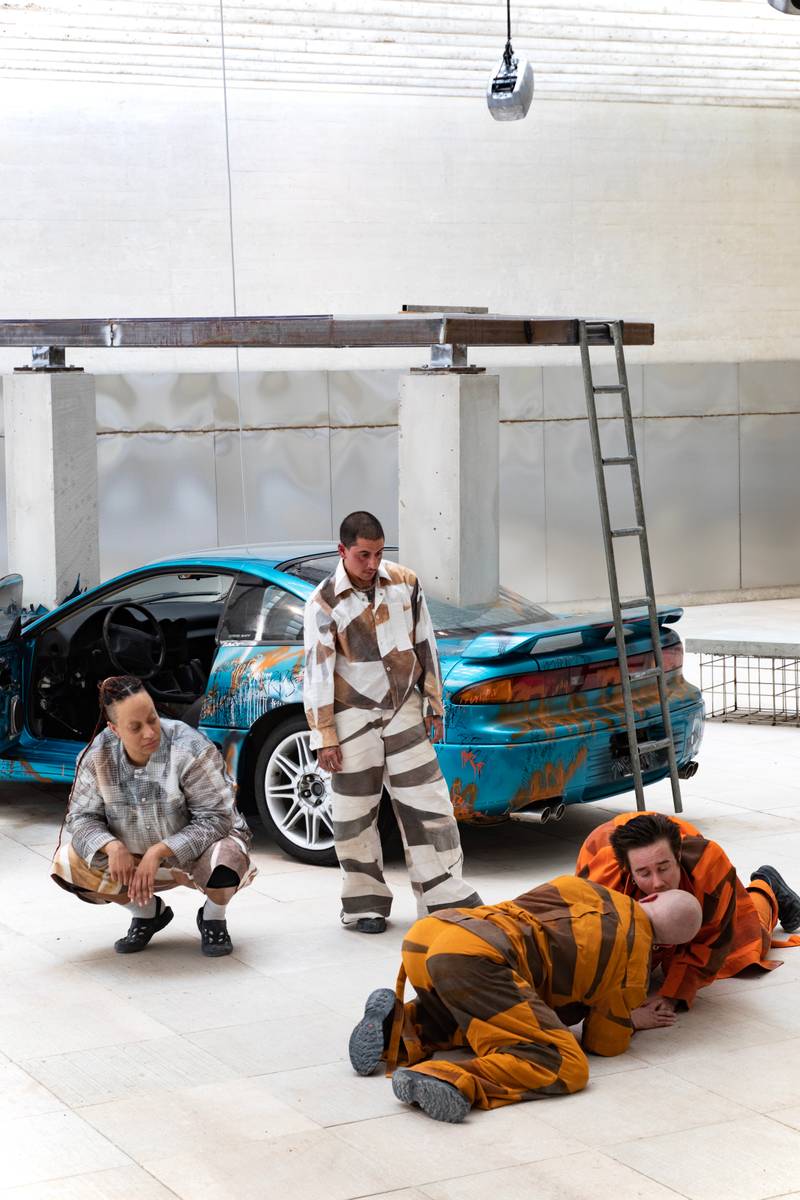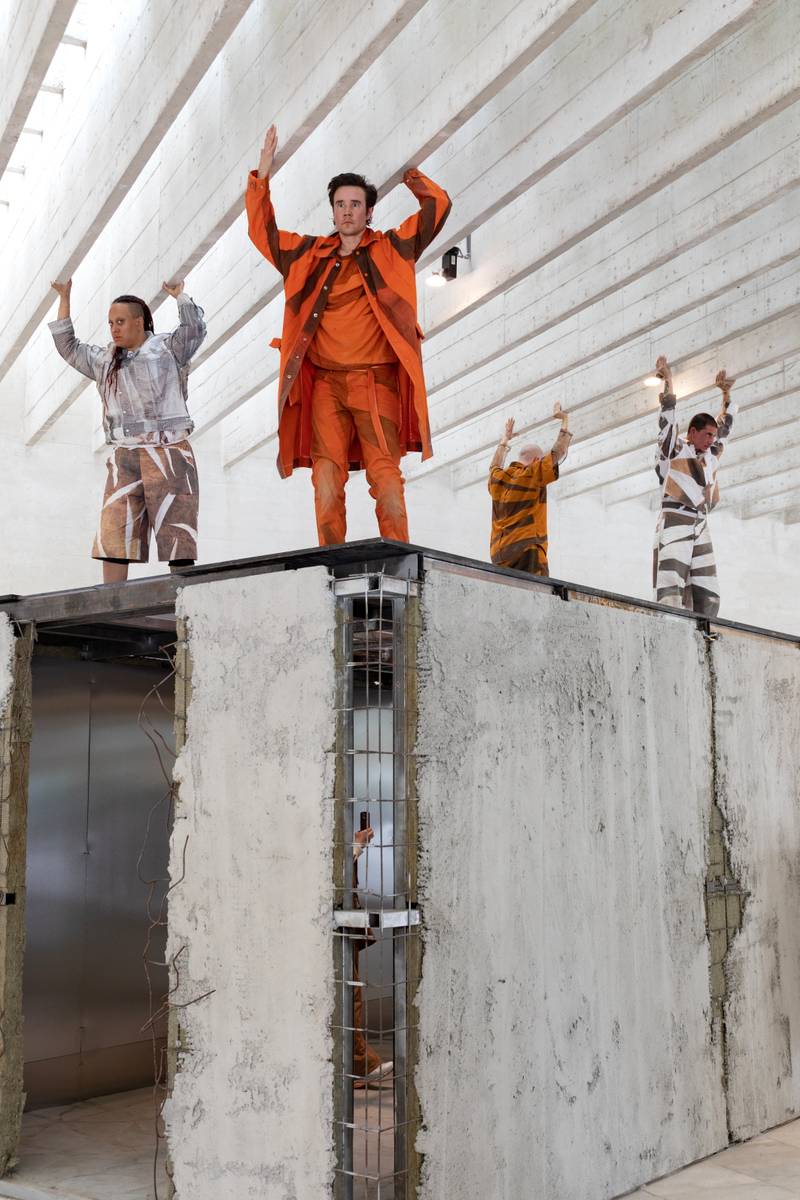 The aesthetics of Ala-Ruona’s work are very recognisable. His early solo performances, like toxinosexofuturecummings (2019) and My flesh is in tension, and I eat it (2020), had a delightfully home-made feel, despite the virtuosity of the performance’s gestures. They were bursting with a dark, guttural, sexual, painful energy that was spat on the audience in screams and sometimes fake blood, with the performer’s body suspended between ultimate control and something utterly uncontrollable. Since then, starting around Lacuna (2021), whilst the darkness remains, his works have taken on a decidedly more produced and polished appearance. The works with more performers, e.g., Parachorale (2024), include silly and goofy affects and a layer of humour. The work at hand at the Venice Architecture Biennale ups the ante on production values with its designer clothes, massive concrete structures and promo videos that look like slick, shiny Balenciaga ads.