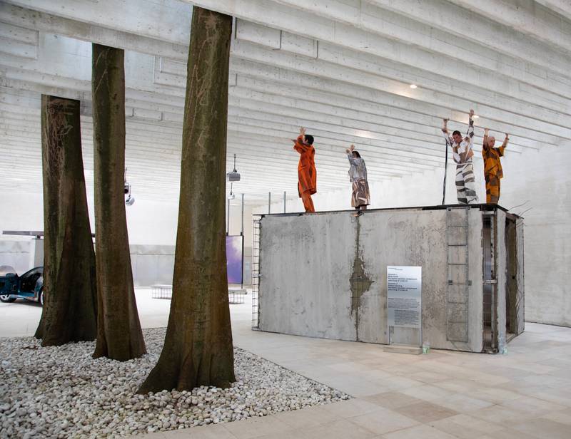 Opening performance of Industry Muscle: Five Scores for Architecture at Nordic Pavilion Biennale di Venezia 2025. L to R: Kid Kokko, Caroline Suinner, Romeo Roxman Gatt, Teo Ala-Ruona