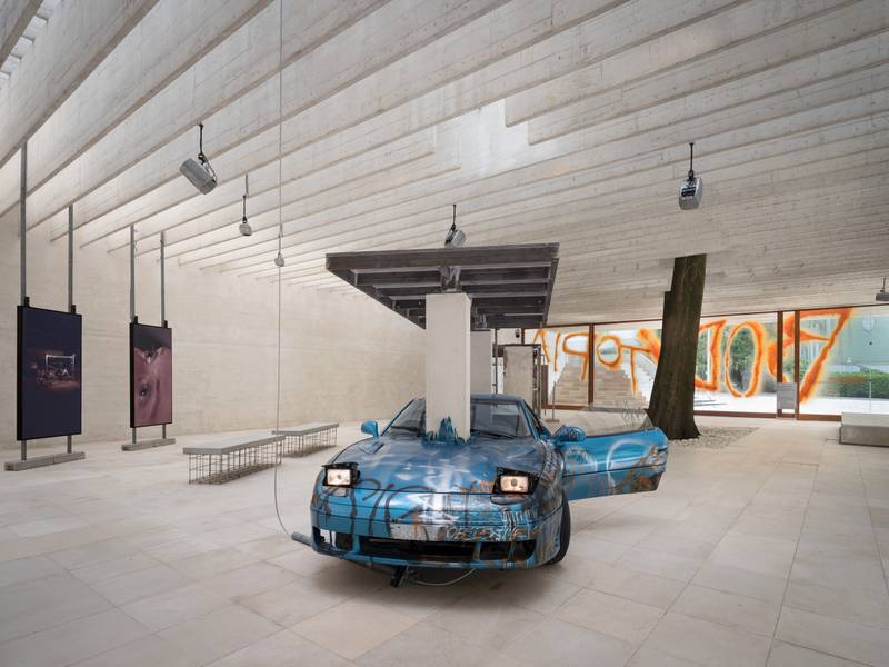 The work itself includes set design by Teo Paaer that is open to audiences as an exhibition throughout the biennale, a performance on the opening weekend, a video and an essay. The exhibition consists of the derelict sports car we saw in the video, which appears to be the same car that was used in Ala-Ruona’s Enter Exude (2023), penetrated by two concrete beams, holding up another slab of concrete. There is a massive, rectangular, shelter-like structure which appears to be made of steel-reinforced rugged concrete, contrasted with shiny, even steel plates on the inside walls. The exhibition also features a two-channel video installation made by Venla Helenius, of which there is no material online that we are aware of. On the glass facade of the pavilion graphic designer Kiia Beilinson has spray-painted with a thick, drippy orange line the word Bodytopia.