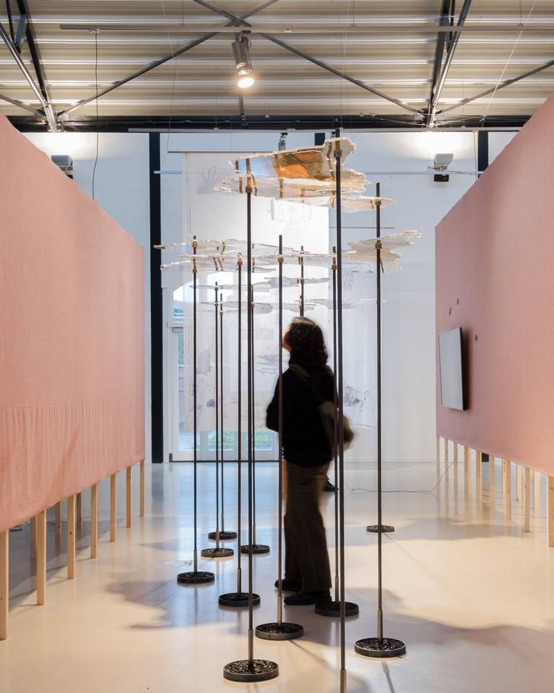 Walking into Shapeshifters (2025) at Framer Framed feels, like stepping into a museum that is quietly remaking itself. The fabric walls soften the architecture, transforming the space into a modest, pliable museum—one that breathes. Within these supple boundaries, a lively dialogue unfolds among the works of twelve artists. Their gestures, materials, and stories form a dynamic constellation, each piece leaning toward the next, seeking connection across the soft contours of the exhibition.