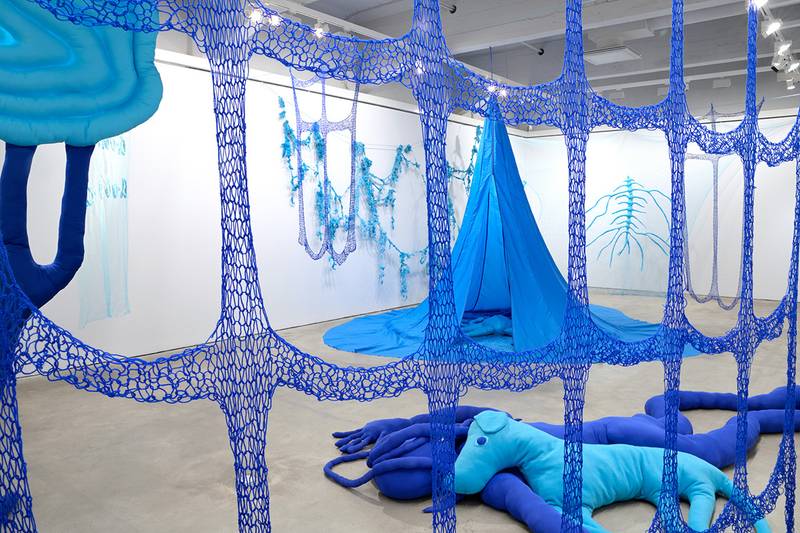 That’s true. And the inherent problems of the material are anyhow present in the whole process. It is difficult yet fascinating to let go of control and allow your works to take on new contexts. Some of my used materials are natural fibers that will decompose while plastics remain longer. In this show, I imagined the installation from a future perspective. I saw this image of a strange underwater graveyard of objects refusing to decompose, made of materials that in that abstract future no longer exist.